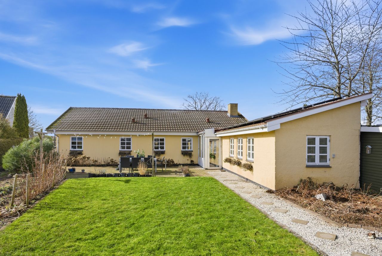 Grunden giver god plads til leg, trampolin og sommerhygge. Derudover får I både garage og carport, så både bil og opbevaring er tænkt ind.