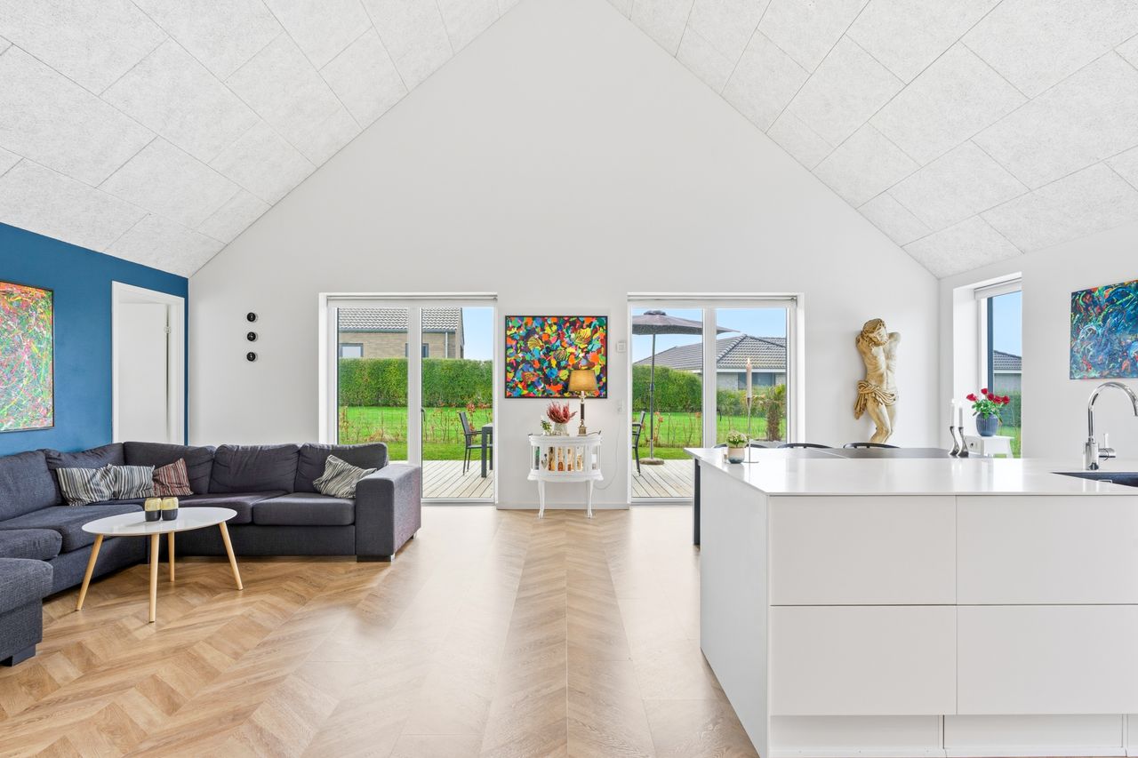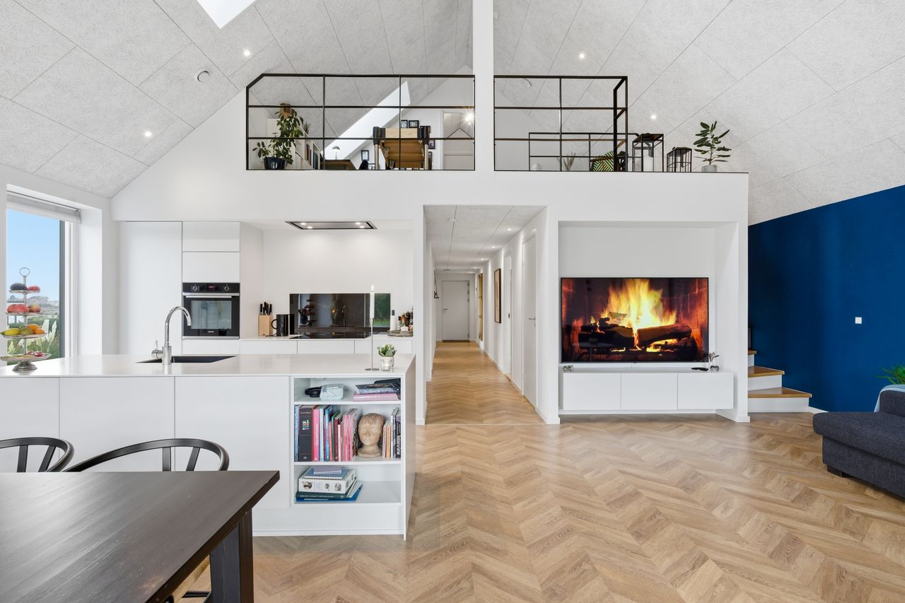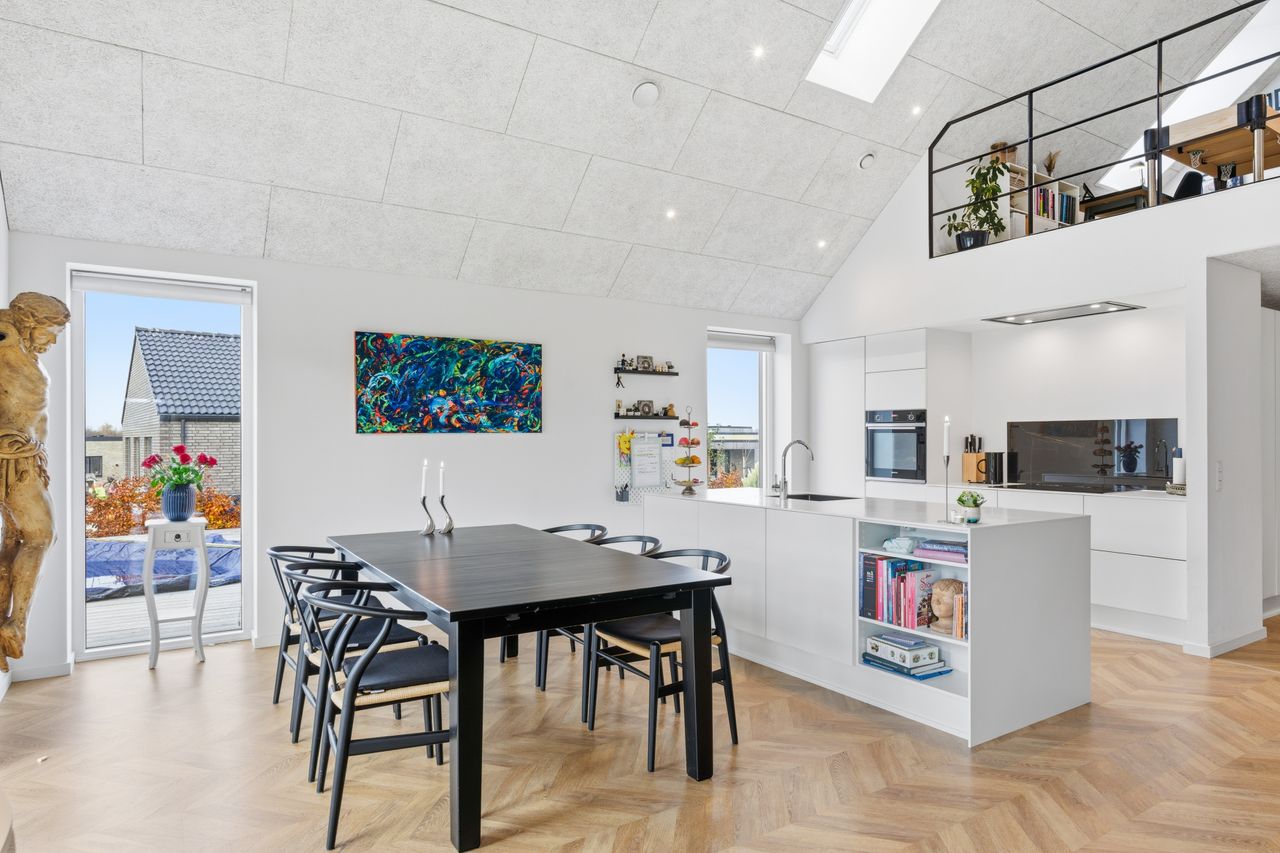 Husets helt store samlingspunkt er det imponerende køkken-alrum og stue med loft til kip og ca. 5,5 meters loftshøjde. De markante vindues- og terrassedørspartier i gavlen åbner rummet op mod terrassen, hvor troldtektlofterne elegant fortsætter ud i den overdækkede del. På varme sommerdage skabes en flydende overgang mellem inde og ude, og hele området fungerer som ét stort opholdsrum.